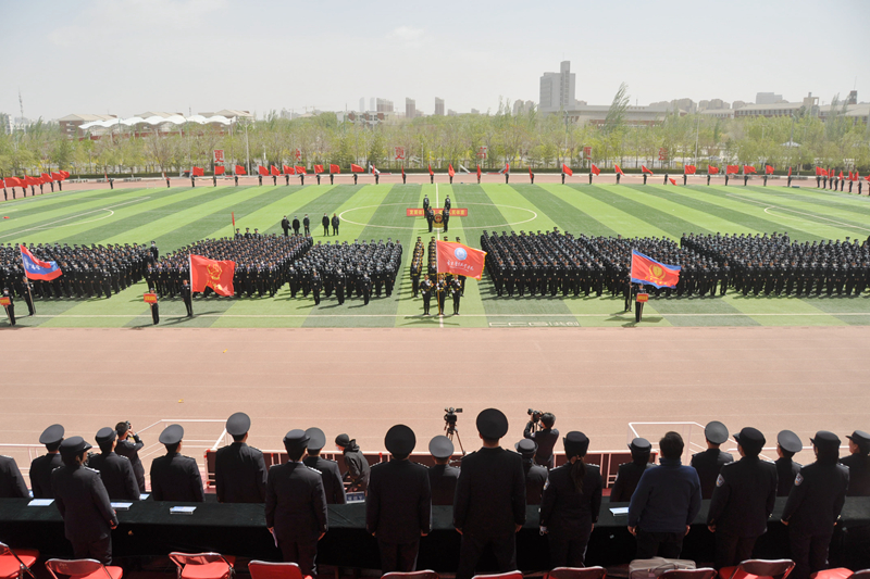 上午九点,庄严的国歌奏响在警院上空。学院仪仗队方阵,训练有素,气宇轩昂、目光坚毅、步履铿锵地走在最前列;警徽方队、红旗方队紧随其后,精神抖擞、英姿飒爽。