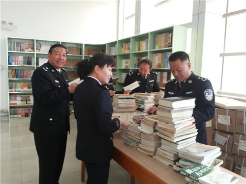 “君子书架”图书漂流捐书活动现场,中职部五年法律事务1302区队在班主任刘金老师带领下捐书。