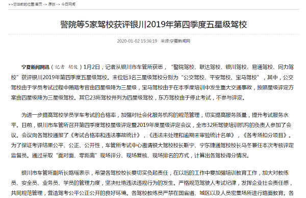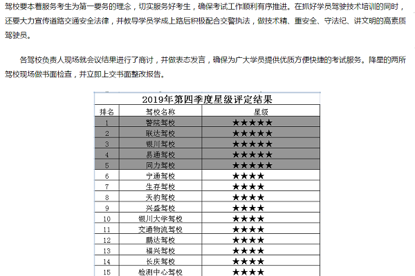 警院等5家驾校获评银川2019年第四季度五星级驾校