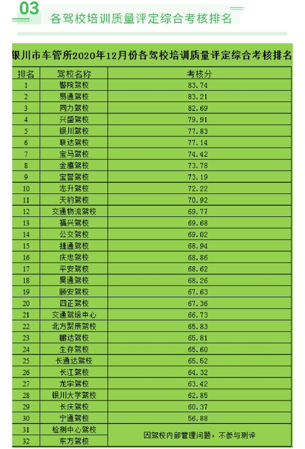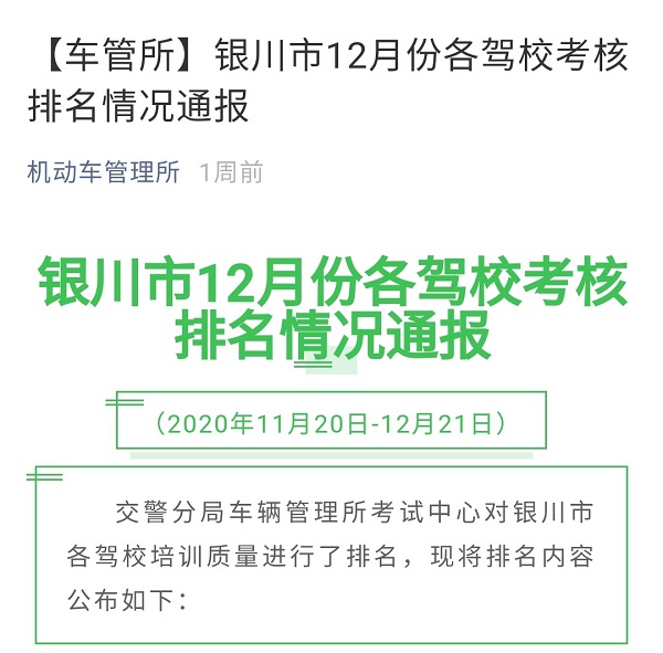 银川市12月份各驾校考核排名情况通报