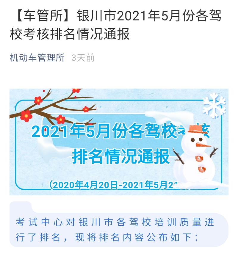 银川市2021年5月份各驾校考核排名情况通报