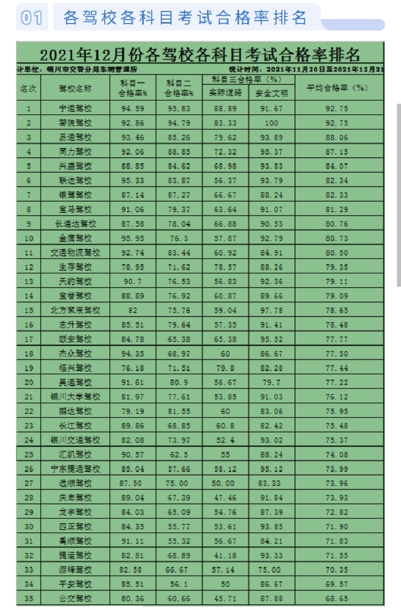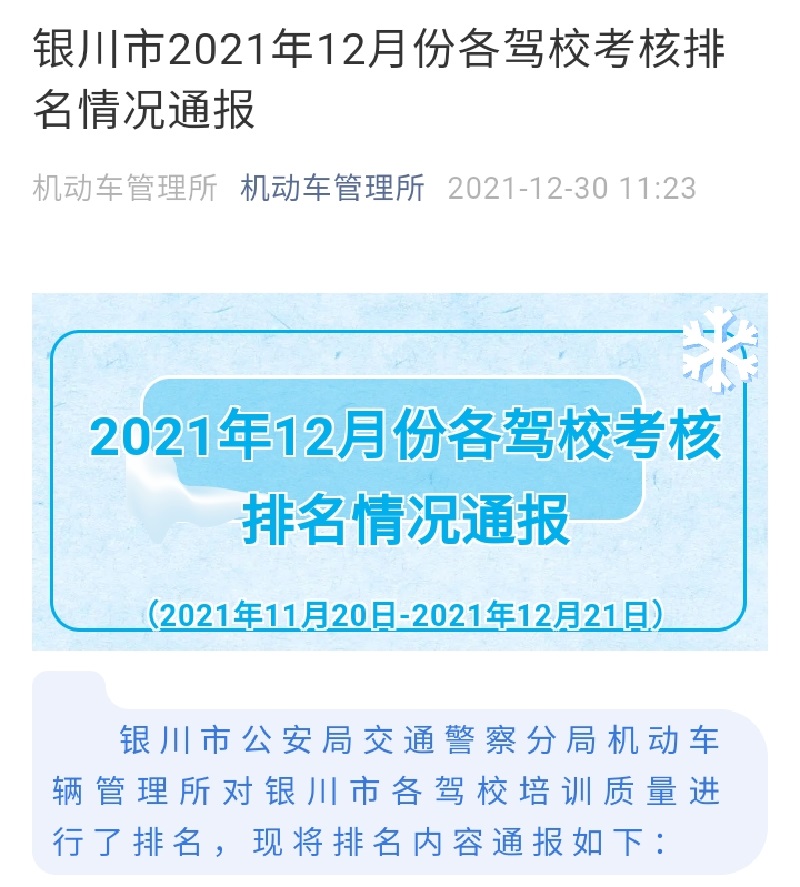 银川市2021年12月份各驾校考核排名情况通报