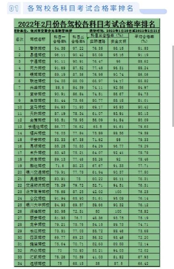 银川市2022年2月份各驾校考核排名情况通报