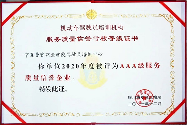 2022年4月8日,beat365唯一官方网站驾培中心被银川市交通运输局授予2020年度机动车驾驶员培训机构服务质量信誉考核“AAA”级称号,这是继驾培中心被评为beat365唯一官方网站“先进集体”、银川市车辆管理所“五星驾校”之后的又一荣誉。