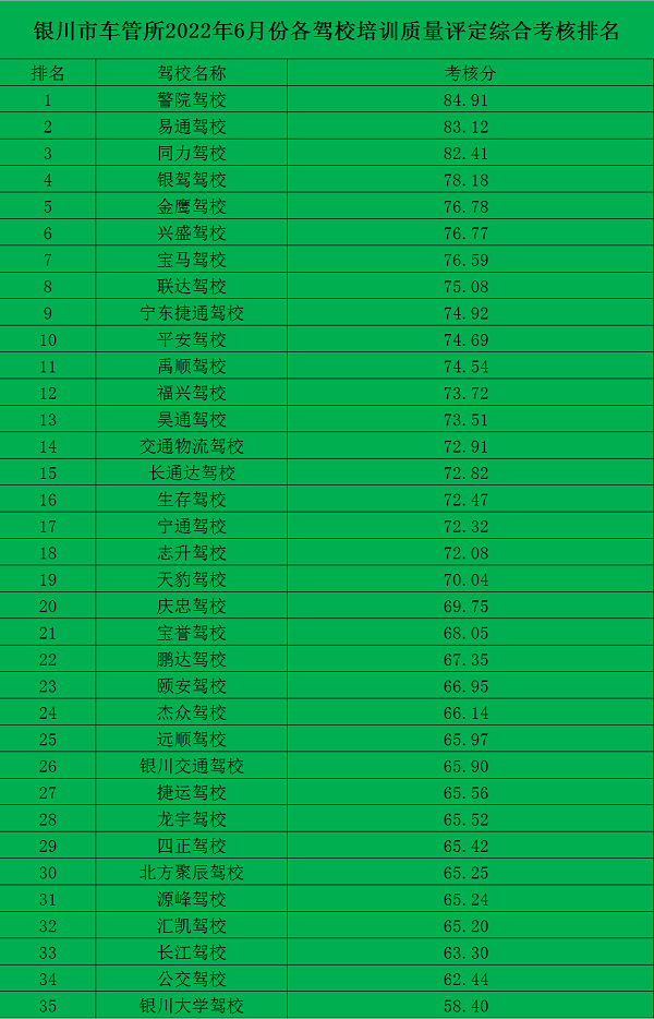 银川市6月份各驾校考核排名情况通报