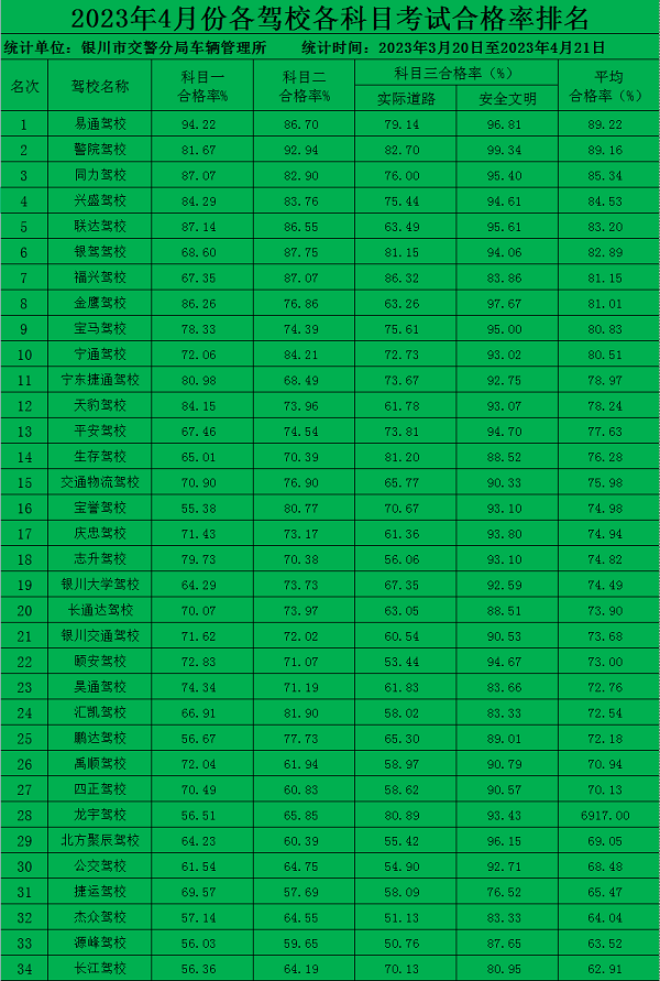 银川市4月份各驾校考核排名情况通报