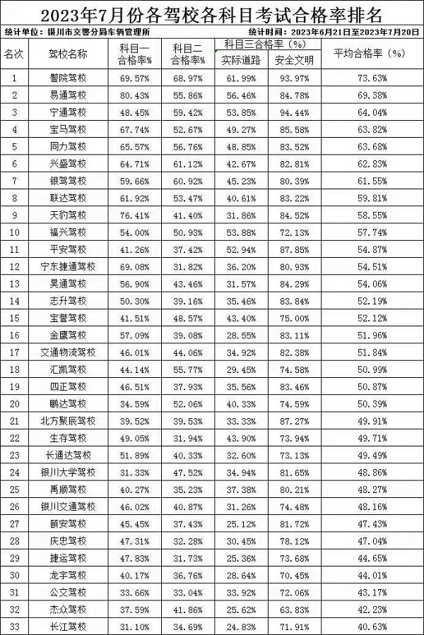 银川市7月份各驾校考核排名情况通报