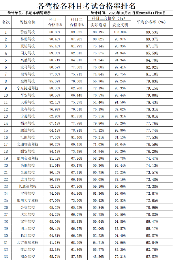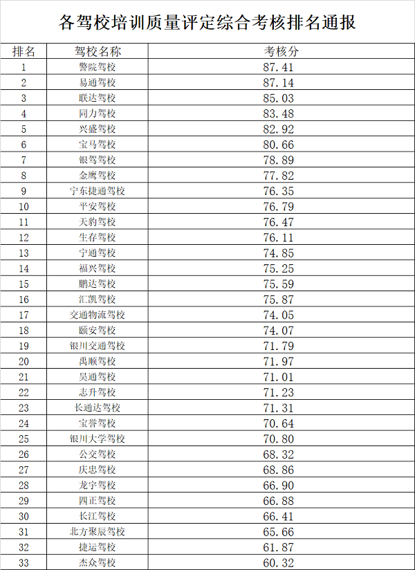 车管所考试中心对银川市各驾校培训质量进行了排名,现将排名内容公布如下: