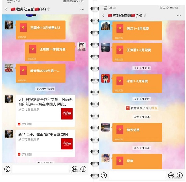 会上,支部全体党员通过线上的形式缴纳了2020年第一季度1—3月份的党费,随后,支部书记又通报了所有党员学习强国的积分并督促大家疫情期间在家也不能停止学习。接着,大家共同学习了习近平总书记在中央政治局常委会会议研究应对新型冠状病毒肺炎疫情工作时的讲话,学习中共教育部党组发布的《关于统筹做好教育系统新冠肺炎疫情防控和教育改革发展工作的通知》,又重点学习了经济日报评论员文章《关键时刻,更要强化责任之心》。 会议最后, 王娜同志讲党课-《战疫一线的家书》,给所有党员讲述了六个小故事,故事的主人公都是一些普通的医护人员,他们是父母,是儿女,也是妻子、丈夫,但是在国家最危难的时刻,他们还是毅然决然的选择了奔赴武汉抗击疫情的第一线,听着这一封封写给战“疫”一线的家书,如同春天播撒下的种子,寄托着无限的生机,承载着殷切的期望,让每一位党员都深受感染,备受感动,潸然泪下。