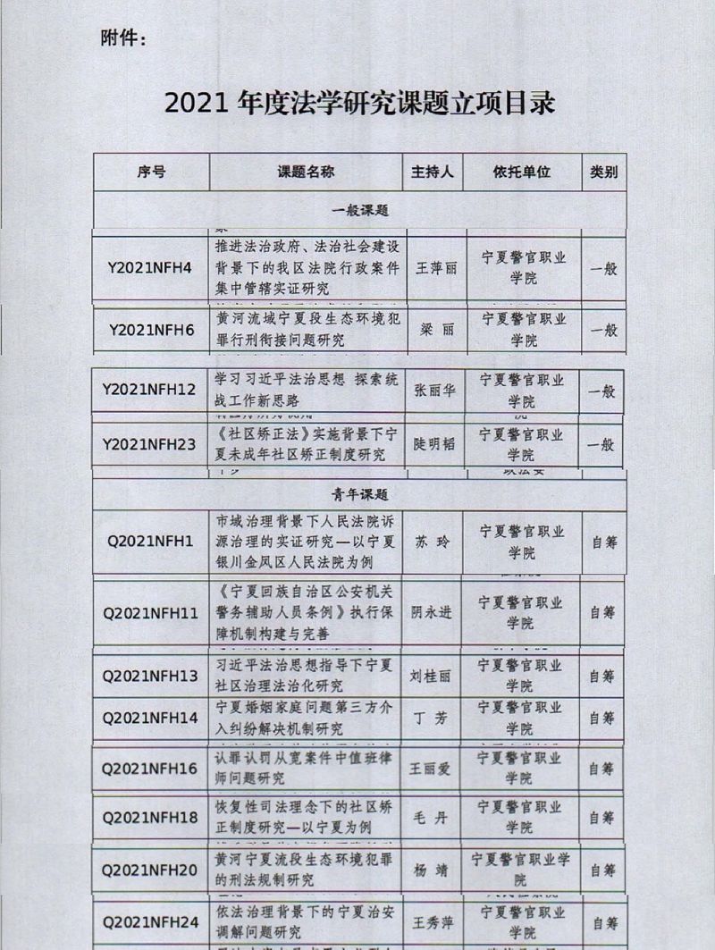 根据《关于申报2021年度自治区法学会法学研究课题的通知》(宁法会通[2021]7号)精神,beat365唯一官方网站科研处组织全院教师积极申报,最终beat365王萍丽老师主持的《推进法治政府、法治社会建设背景下的我区法院行政案件集中管辖实证研究》等12项课题获得立项。