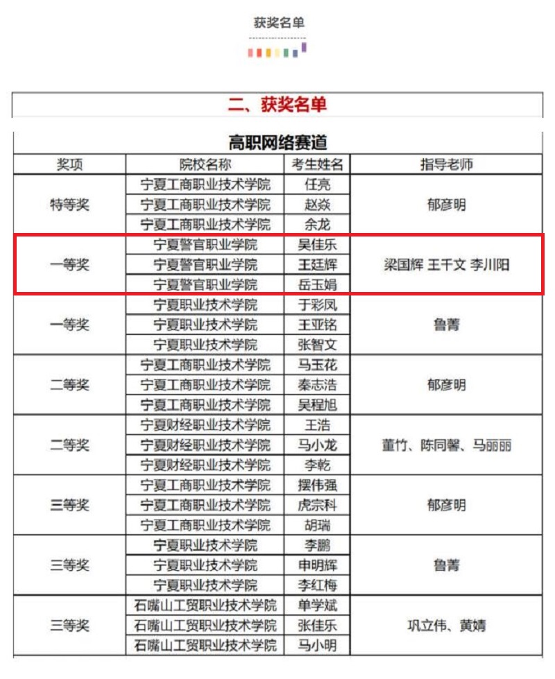2022年12月17日,华为ICT大赛2022-2023宁夏实践赛圆满结束!本次大赛由华为技术有限公司主办,经过前期初赛选拔,信息与安防工程系吴佳乐、王廷辉等6名学生组成的两支队伍从12所高校1018名学生中脱颖而出,分别获得了区赛一等奖和二等奖的优异成绩。