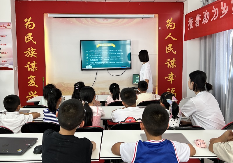 为贯彻落实习近平总书记关于教育的重要论述和关于语言文化的重要指示批示精神,加大国家通用语言文字推广力度,服务铸牢中华民族共同体意识,助力乡村振兴战略实施。实践团开展经典诵读推普教学,带领小朋友们朗诵红色经典诗词,激发儿童的民族自豪感和历史责任感,掌握国家通用语言文字,赓续爱国精神,弘扬中华优秀传统文化。