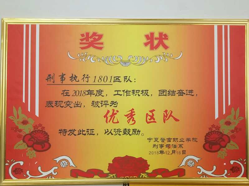 为深入贯彻落实习近平新时代中国特色社会主义思想和党的十九大、全国教育大会精神,引导广大学生树立爱国、爱校的主人翁意识,刑事司法系根据学院党委2019年重点工作提出的“五评五选两推进”的要求,积极组织开展“五评五选两推进”之“党建好支部、团建好支部、系部好区队、系部好干部、系部好学生”系列评选活动,以此选树典型、引领示范、激发活力、凝聚动力,促使全系各区队学生不断崇尚先进、学习先进、争当先进,推动各项工作实现新突破、取得新成就。现评选推出“五评五选两推进”系列活动(一)系部好区队——刑事执行1801区队。