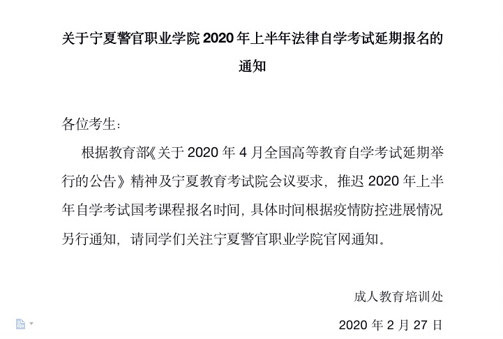 关于beat365唯一官方网站2020年上半年法律自学考试延期报名的通知