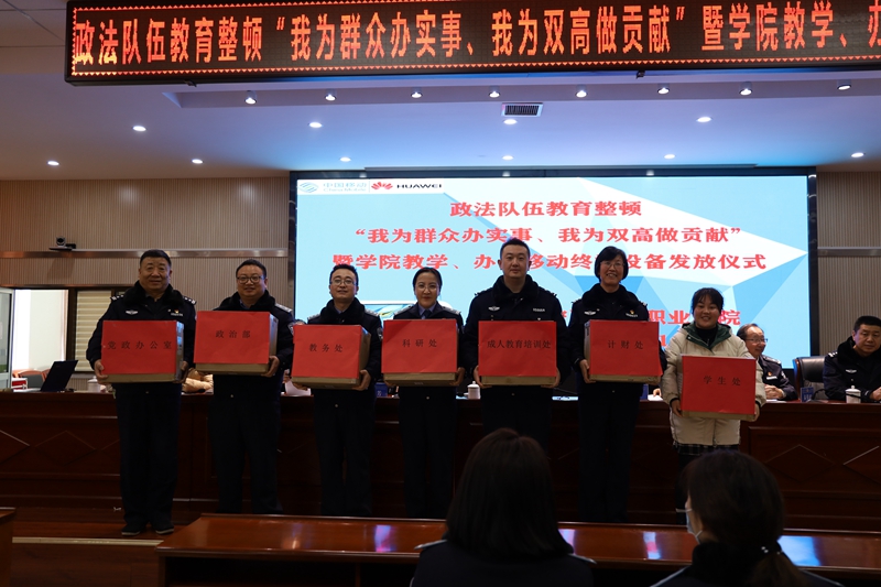 刘书记强调,开展政法队伍教育整顿是以习近平同志为核心的党中央从党和国家事业发展全局高度作出的重大决策部署,是继党史学习教育之后,在政法系统践行初心使命的又一次再教育。学院党委以队伍教育整顿为契机,开展“我为师生办实事”主题实践活动,既是贯彻落实党中央关于开展政法队伍教育整顿的政治要求,也是贯彻落实习近平总书记 “学党史、悟思想、办实事、开新局”要求的具体行动。今年学院投资5118万元新建了教学楼、宿舍楼,投资420万元新建了操场,投资2000万元建设了智慧教室、开通了光网、更新多媒体教室,最近又筹措资金130万元为每名教职员工配备了教学、办公移动终端,这是学院党委把队伍教育整顿同解决广大师生的实际需求紧密结合起来的一项具体措施,是践行“以师生为中心、为师生服务”,想师生之所想、急师生之所急,切实解决广大师生反映强烈的“急难愁盼”问题的重要一环,也是推进政法队伍教育整顿走深走实的一个很好的抓手和载体。发放移动终端设备让每一名教职员工都能享受到学院的发展成果,都有了获得感、幸福感,希望学院每一个教职工以今天的发放仪式为新的开端,勤奋工作,真心为师生办实事、解难题,共同努力奋斗,以更加饱满的热情和更加高昂的斗志投入到各项工作当中,充分发挥移动教学办公设备的作用,为加快推进优质校、双高建设作出自己应有的贡献。