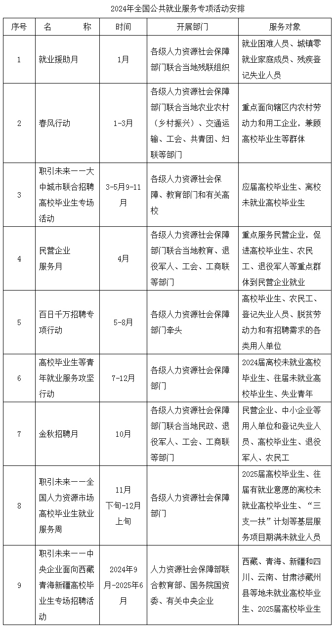 为全面贯彻落实党的二十大精神和党中央、国务院关于稳就业工作决策部署,推进实施就业优先战略,进一步加强人力资源合理配置和劳动力市场供需对接,推动实现高质量充分就业,现就2024年全国公共就业服务专项活动有关事项通知如下: