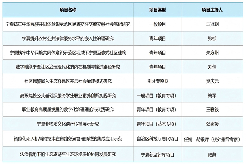 一、科研项目立项取得新突破。本年度学院共有15项课题获2024年法学会研究课题立项,11项科研项目获2024年高校科学研究项目立项。尤为可喜的是,省部级课题立项成绩斐然,10项课题获批立项,其中,1项课题获自治区科技厅东西部科技成果转化专项课题立项,1项课题获第七批宁夏新型智库课题立项,“社区民警嵌入生态移民区基层社会治理模式研究”“宁夏铸牢中华民族共同体意识示范区民族交往交流交融社会基础研究”等8项课题获2024年自治区社科规划项目立项,立项数在全区高职院校中排名前列,标志着学院在探索构建公安职业院校特色发展路径中取得了阶段性成果,以及发挥高层次人才学术引领初见成效。