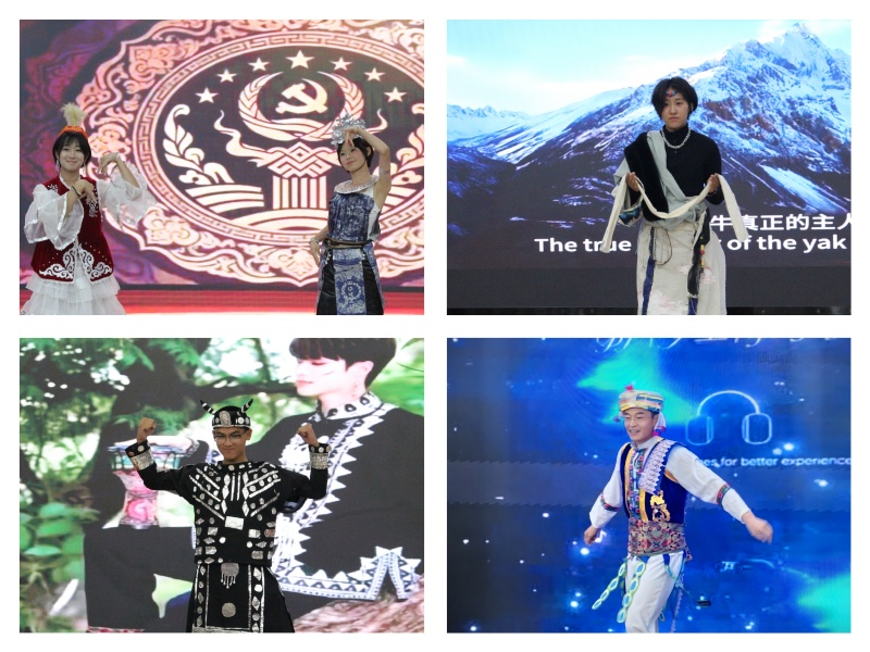 学生们亲手制作的服装精美绝伦,运用多样手工技艺,将我国民族传统服饰融入显著文化元素进行创新制作,从蒙古族长袍的草原情怀,到藏族哈达点缀雪域圣洁,从苗族银饰的闪耀匠心,到彝族服饰的红黑配色传递文化密码,每一款民族服饰都绽放着迷人光彩。学生们的自信走秀,搭配精心挑选的音乐、背景视频与解说词,生动呈现各民族的风情风貌,让所有人身临其境地感受民族文化的博大精深。