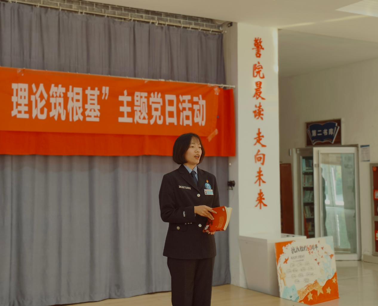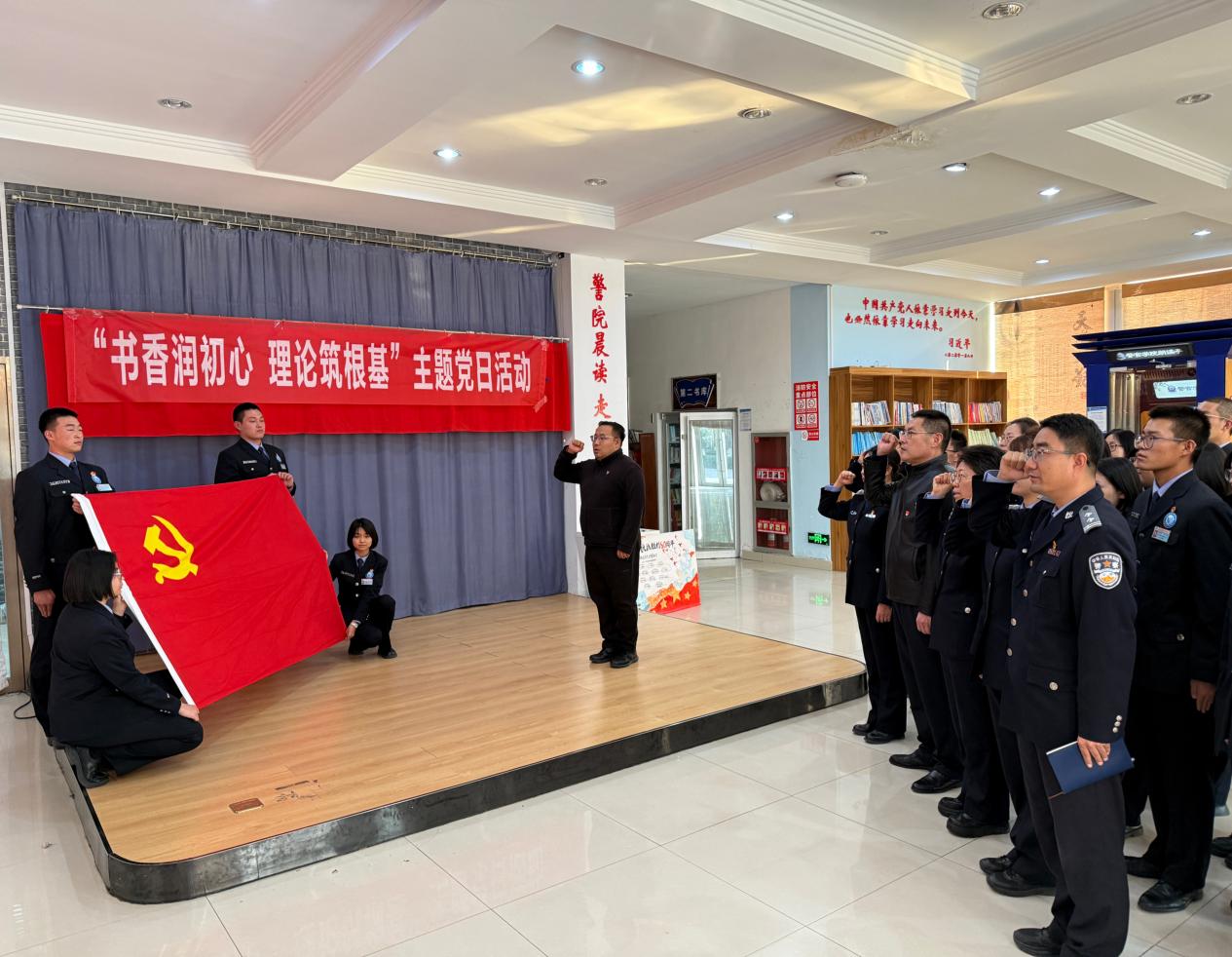 随后,两名学生代表围绕所借书籍依次登台。生动讲述书籍核心故事,分享从中提炼的人生感悟与思想启发。英烈故事分享环节,团员代表以“抗战英烈精神传承”为主题,讲述了英烈坚守信仰、无私奉献的感人事迹。结合刑事司法系专业特色,师生们围绕“英烈精神与法治建设”“如何以专业力量践行初心使命”展开讨论,同学们纷纷表示要以英烈为榜样,将爱国情怀与专业担当融入日常工作与学习,切实履行育人职责与成长使命。重温入党誓词环节,全体党员面向党旗肃立,举起右拳庄严宣誓。铿锵有力的誓言回荡在图书馆大厅,不仅强化了党员的身份意识与责任意识,更让在场团员、学生感受到党组织的凝聚力与向心力。