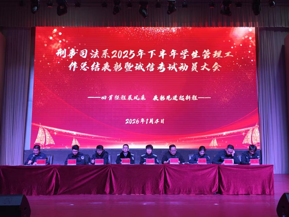 为深入贯彻育人方针、持续深化学生管理工作质效,扎实推进学风建设与诚信教育,表彰先进典型。刑事司法系于1月4日举办学生管理工作总结表彰暨期末诚信考试动员大会。刑事司法系主任梁丽、副主任阴永进、党总支副书记满君杰、学员队全体成员以及24、25级全体学生共同参加。