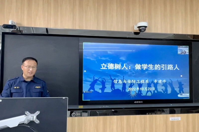 10月29日,信息与安防工程系党总支书记辛建平以“立德树人:做学生的引路人”为题从对警务化管理再认识、辅导员工作职责进行授课并将自己从事学生管理工作23年总结出的学生干部选拔、班级学风建设和干好工作的“五要“”五不要”等方法与新入职辅导员进行分享。